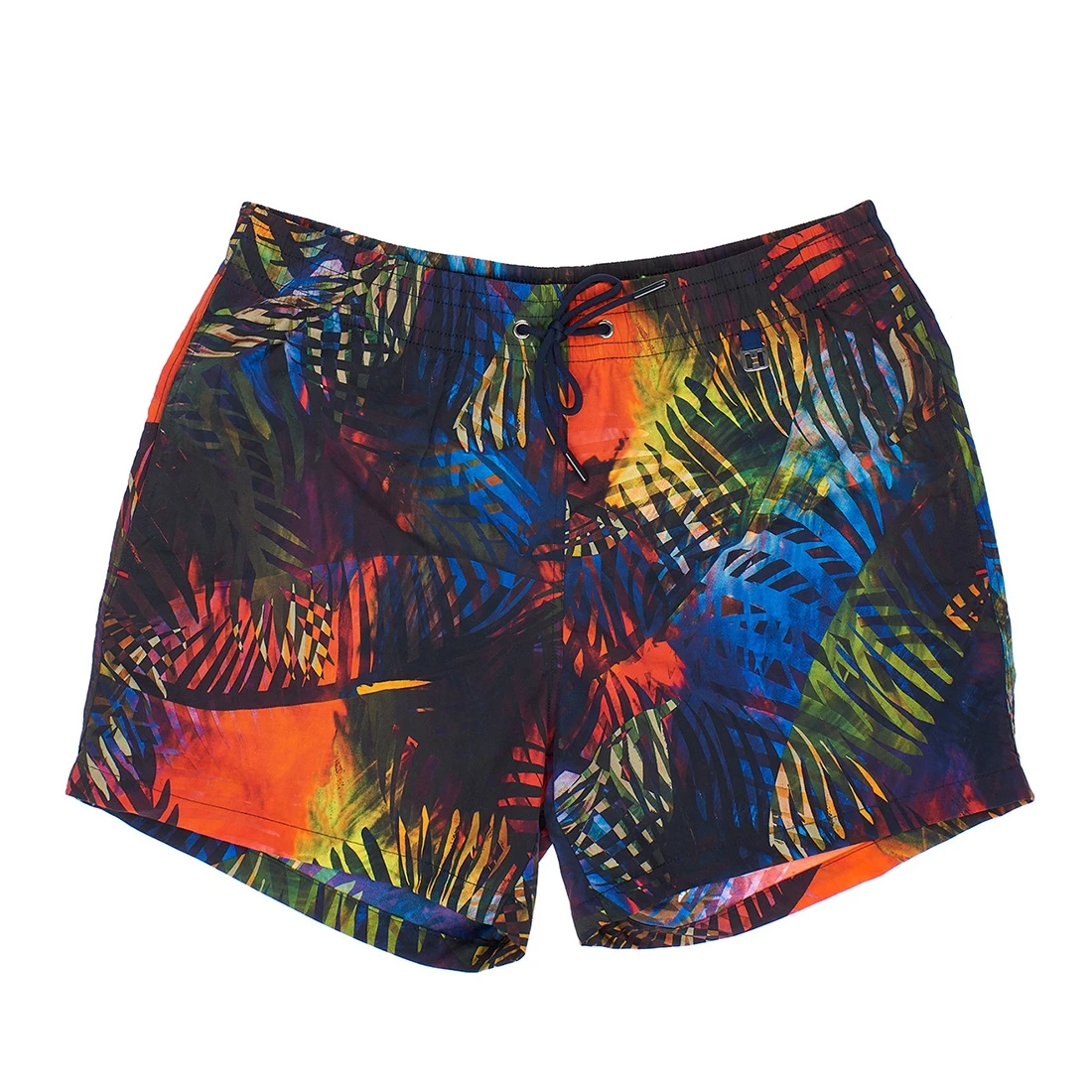 - Short de bain pour homme en polyamide imprimé de feuillages exotiques coloré dans des tons de rouge, jaune et vert sur fond bleu marine.
