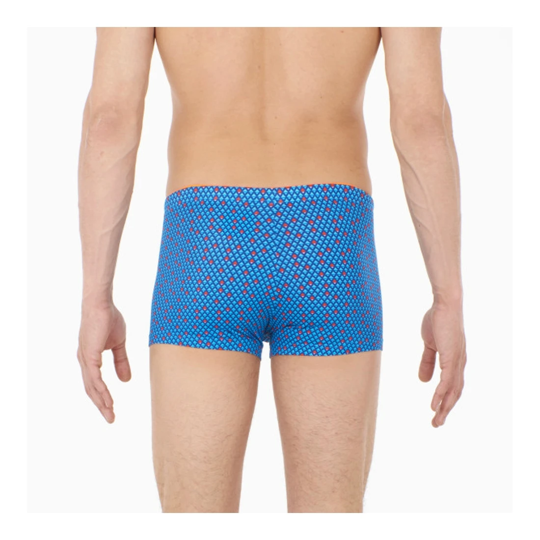 - Boxer court de bain lycra pour homme en polyamide élasthanne imprimé avec un motif géométrique multicolore en bleu turquoise et orange