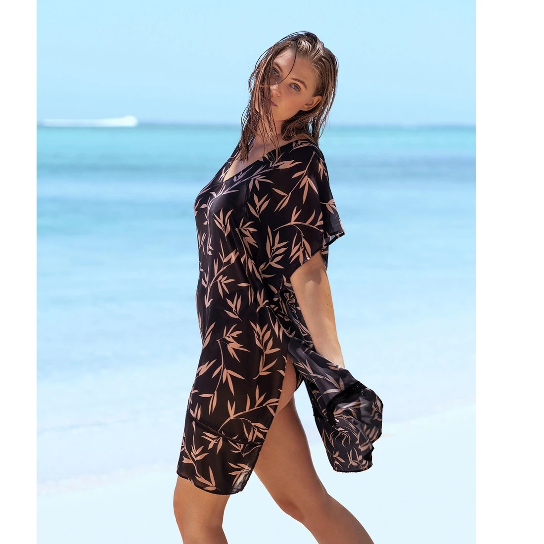 Protégez-vous du soleil avec style dans le Kaftan Luna Bay en Lacquered Black. Mi-long et léger, ce style est un indispensable de votre garde-robe estivale. Décoré d’un imprimé de feuilles de bambou très chic, doté d’un joli détail en point d’échelle et agrémenté d’un décolleté en V très seyant.